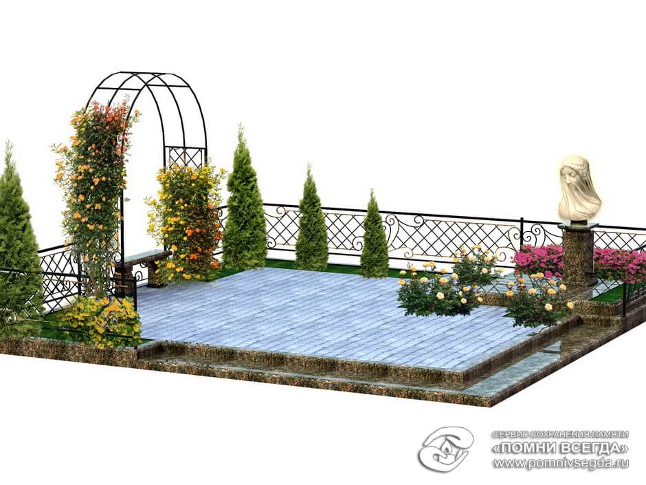 Модель современного подхода к обустройству места захоронения. Большая открытая зона создает ощущение пространства и свободы. Небольшая надгробная композиция делает акцент на форме. Общая идея создает место захоронения подобно зоне отдыха и располагает к большему погружению в воспоминания.