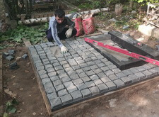 Начинаем укладывать брусчатку, параллельно монтируя цветник из гранитных балок. Кое-где целые квадратики не помещались, поэтому нам приходилось распиливать