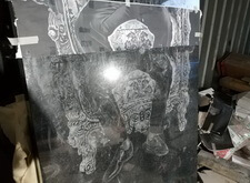 Предварительно станком делается портрет лица усопшего, остальная гравировка – ручная работа. В последнем кадре из подборки представлено ростовое изображение, плита расположена вертикально.