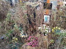 На данном участке был проведён сравнительно большой объём работ. Первым делом были убраны сорные растения и сухостой, заполонившие место захоронения. После этого мы помыли и протёрли весь гранит. Далее установили по центру участка вазы, наполнили их водой и поместили внутрь свежие цветы. Для удобства оценки качества проведённой работы мы сфотографировали убранное место захоронения с разных ракурсов.